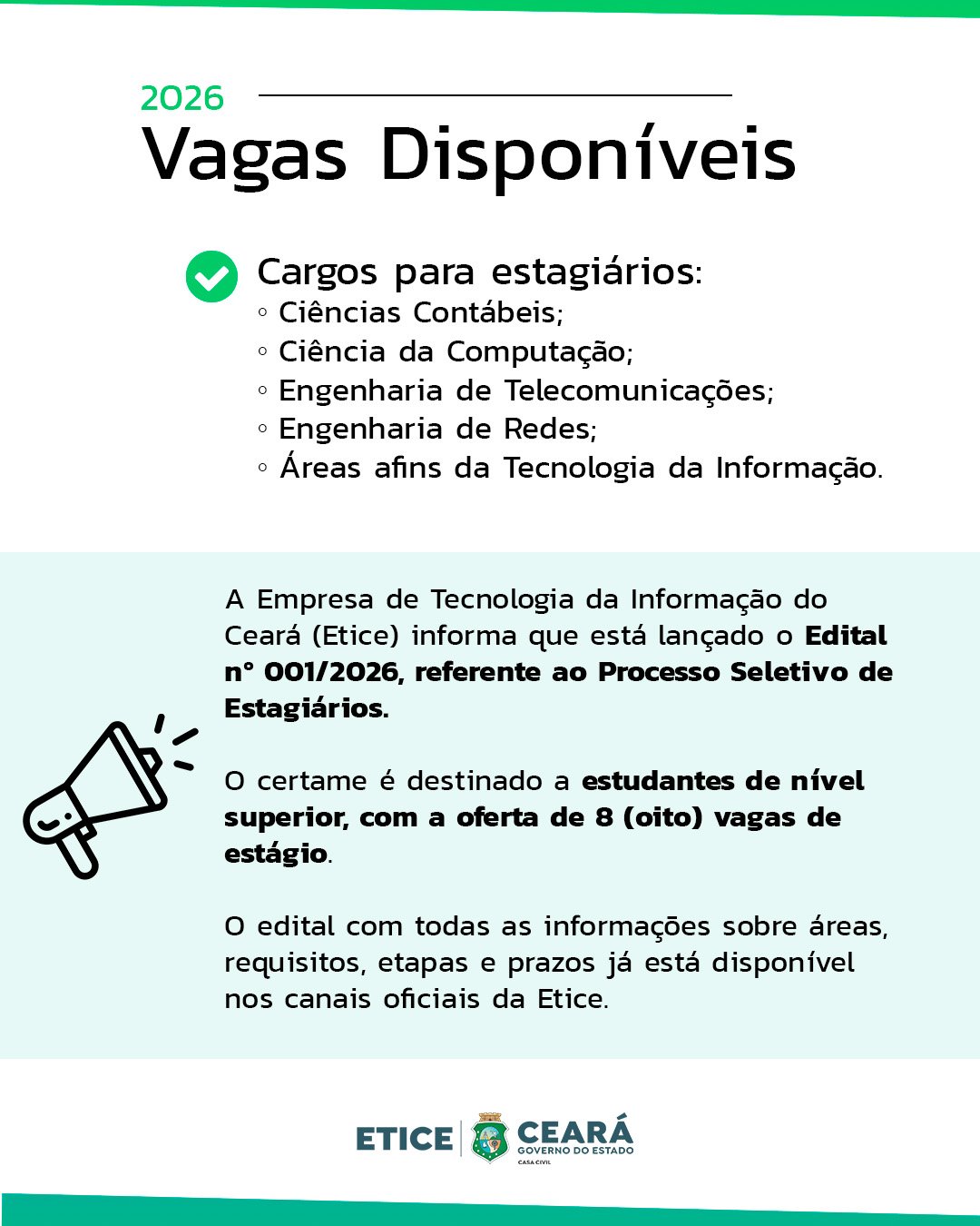 A Empresa de Tecnologia da Informação do Ceará (ETICE) tornou pública a realização do processo seletivo para estagiários de nível superior, conforme o Edital n° 001/2026. Podem concorrer estudantes em áreas de tecnologia ou contabilidade que desejam exercitar seu desenvolvimento profissional em um ambiente inovador. O certame será realizado em duas etapas eliminatórias: Análise de currículo/histórico escolar e Entrevista. As inscrições são gratuitas e devem ser realizadas exclusivamente de forma online no link https://forms.gle/YiU6bNSL5rpxrKVV6.